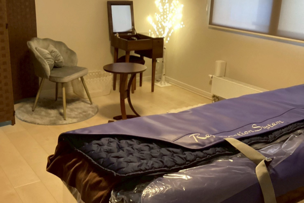 リジュゲルマは、体内の巡りを整える“リジュウォーター”を飲んだあと、遠赤外線ゲルマニウムマットに包まれて、深いリラクゼーションへ。